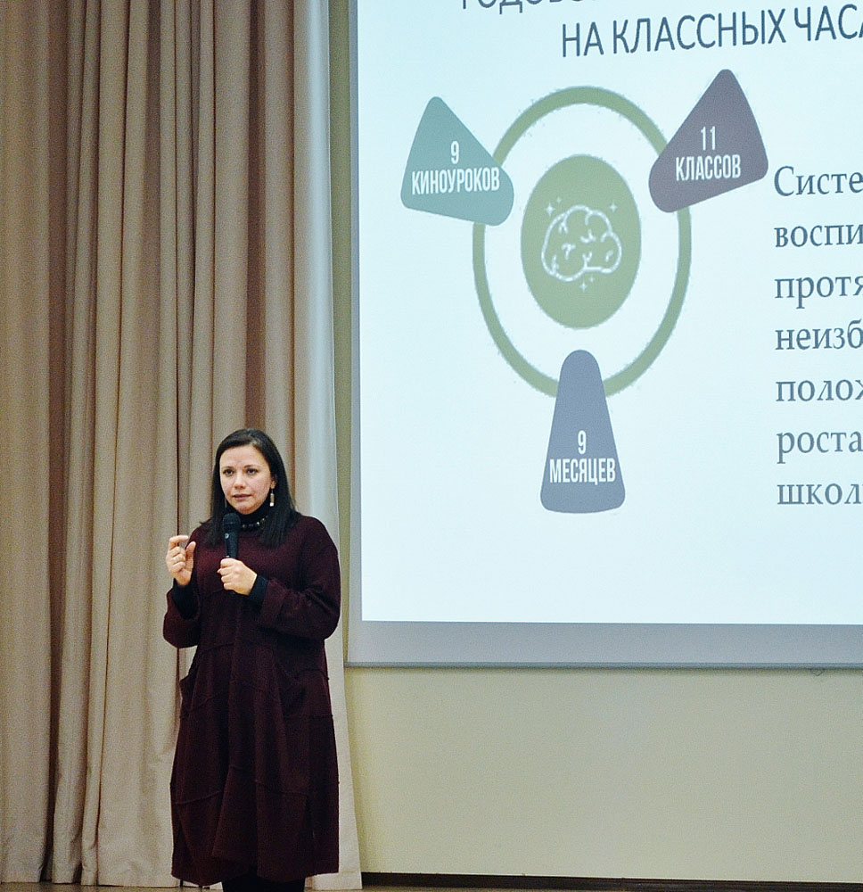 Н.Н. Петрова, заместитель директора по воспитательной работе отметила: «Время меняет все. Прогресс управляет миром. Не меняются только общечеловеческие ценности, такие, как бескорыстие, самопожертвование, сострадание… Наша школа», - сказала она, - первая вошла в проект «Киноуроки», или «Кинопедагогика», познакомившись с ним во время проведения образовательной программы Сбора «Союз – Наследники Победы».