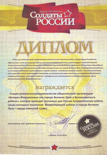 За совместную деятельность с руководством города Великие Луки и этими общественными объединениями ветеранская организация «Ветеран Вооруженных сил» и активные ветераны были награждены руководством города и руководством этих общественных объединений специальными наградами и грамотами. Подробная информация об этом изложена в книге «Служим Отечеству».