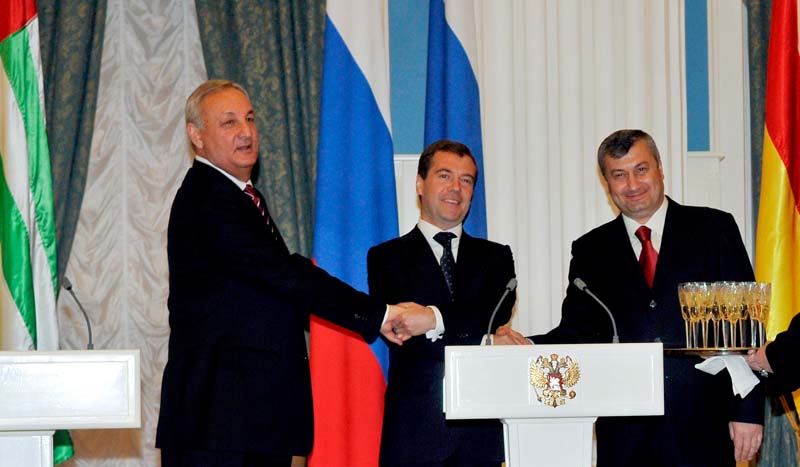 Подписи под российско-абхазским договором в присутствии прессы поставили президент РФ Дмитрий Медведев и президент Абхазии Сергей Багапш. Затем аналогичный договор глава российского государства подписал с президентом Южной Осетии Эдуардом Кокойты.
